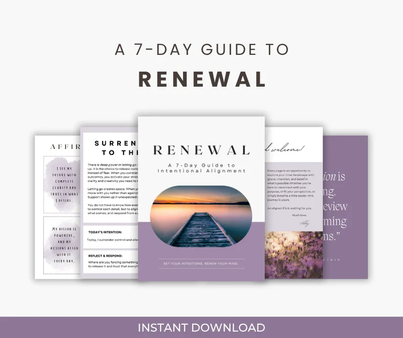 Renewal is a 7-day guided digital workbook designed to help you get clear, feel grounded, and align with the life you actually want.